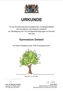 Das Ministerium für Unterricht und Kultus hatte in einer Ausschreibung eingeladen zu einem Wettbewerb bezüglich innovativer und kreativer Ansätze zur Bewältigung der Corona-Beeinträchtigungen an den Schulen in Bayern. Die zahlreichen Lockdowns in den Zeiten der Pandemie hatten Lehrende wie Lernende in eine bislang unbekannte und schwierige Situation versetzt, die aber von allen Lehrkräften und Fachschaften des Gymnasiums Zwiesel in hervorragender Weise gemeistert wurde.