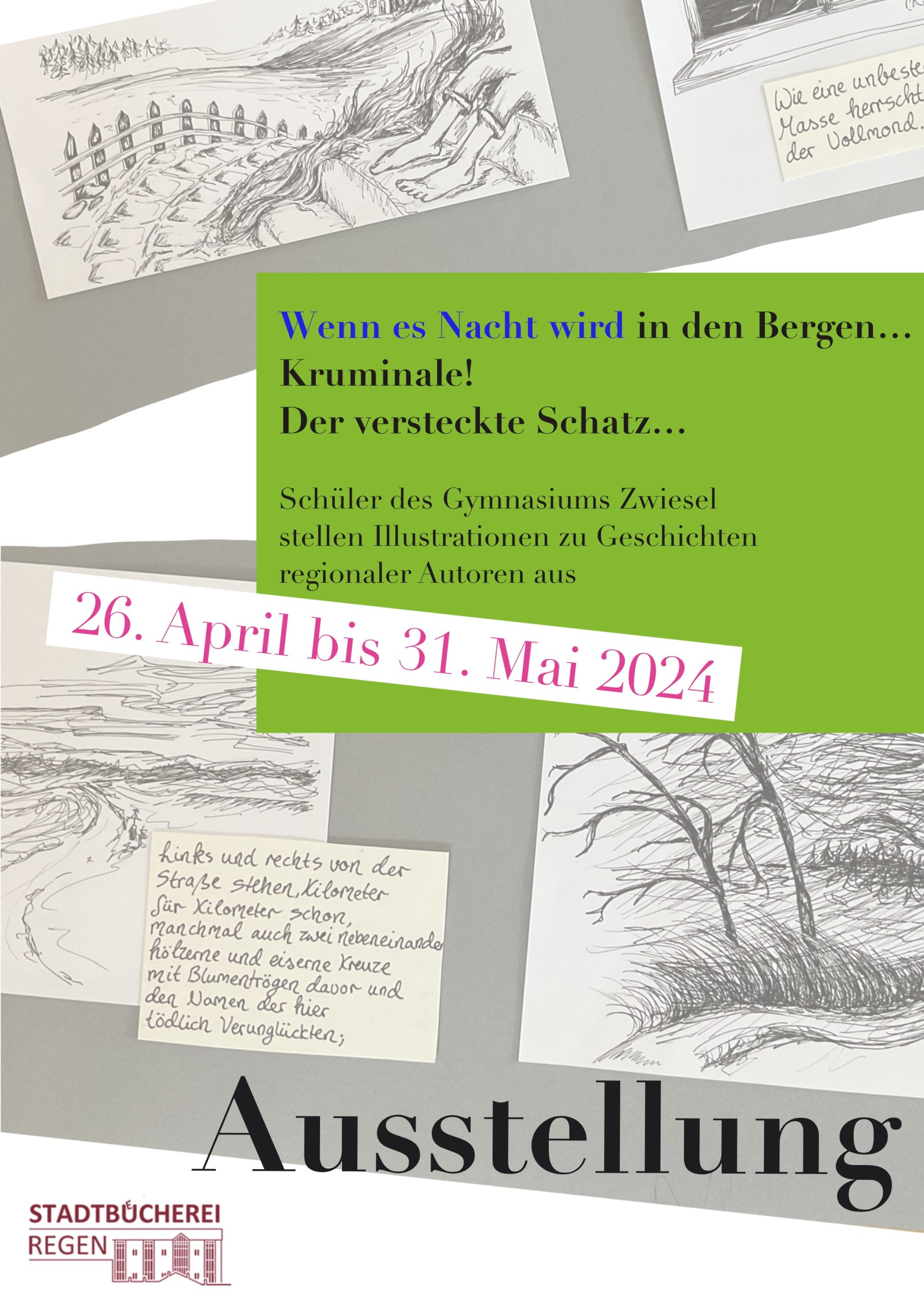 Die Schülerinnen und Schüler der Q12 des Gymnasiums Zwiesel zeigen bis Ende Mai Auszüge ihrer Seminararbeiten aus dem Fach Kunst in einer Ausstellung in der Stadtbücherei Regen. Die jungen Künstler haben es sich zur Aufgabe gemacht, Illustrationen zu literarischen Werken von Autoren der Region anzufertigen.