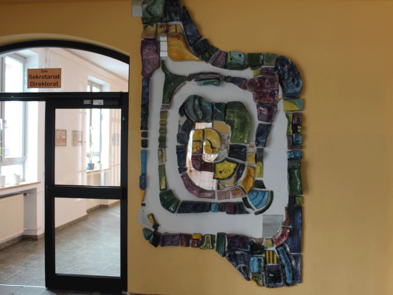 Diese Schule hat schon manch einen Schüler oder eine Schülerin verändert, dieses Mosaik am Haupteingang kann man als ein Zeichen dafür sehen. Die zerbrochenen Spiegelstücke in der Mitte dieses Kunstwerkes, die wieder zusammengesetzt wurden, kann man als Sinnbild für das neue Denken des Schülers oder der Schülerin deuten. Die bunten verschiedenförmigen Steine mit unterschiedlichsten Größen stehen für die zahlreichen Talente, verschiedenen Erfahrungen und für die Hürden, die der eine oder andere bereits bestanden hat.