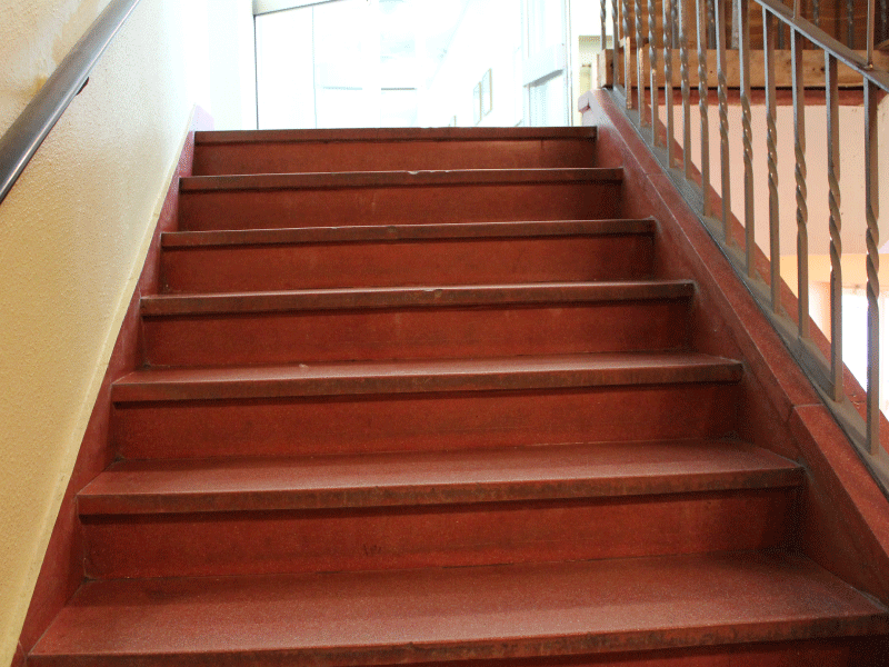 Sie ist alt, etwas ramponiert und hat schon viel erlebt: die Treppe auf dem Weg zur Mensa gleich nach den Deutschräumen. Jedem Schüler an dieser Schule ist sie wohlbekannt, und wenn man ganz leise ist, kann man sie erzählen hören: